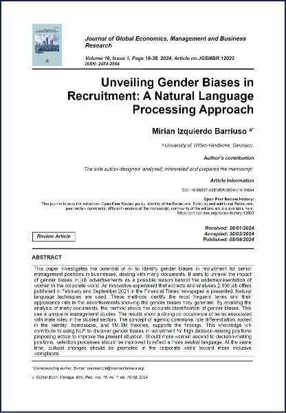 Este artículo investiga cómo la Inteligencia Artificial, mediante técnicas de Procesamiento del Lenguaje Natural (NLP), puede identificar sesgos de género en las ofertas de empleo para puestos de alta dirección. Analizando miles de anuncios del Financial Times, se revela una fuerte predominancia de términos asociados a roles masculinos, lo que contribuye a la baja representación femenina en el mundo corporativo. Descubre cómo el NLP puede ser una herramienta innovadora para detectar y corregir estos sesgos, promoviendo una contratación más inclusiva y diversa en puestos clave.